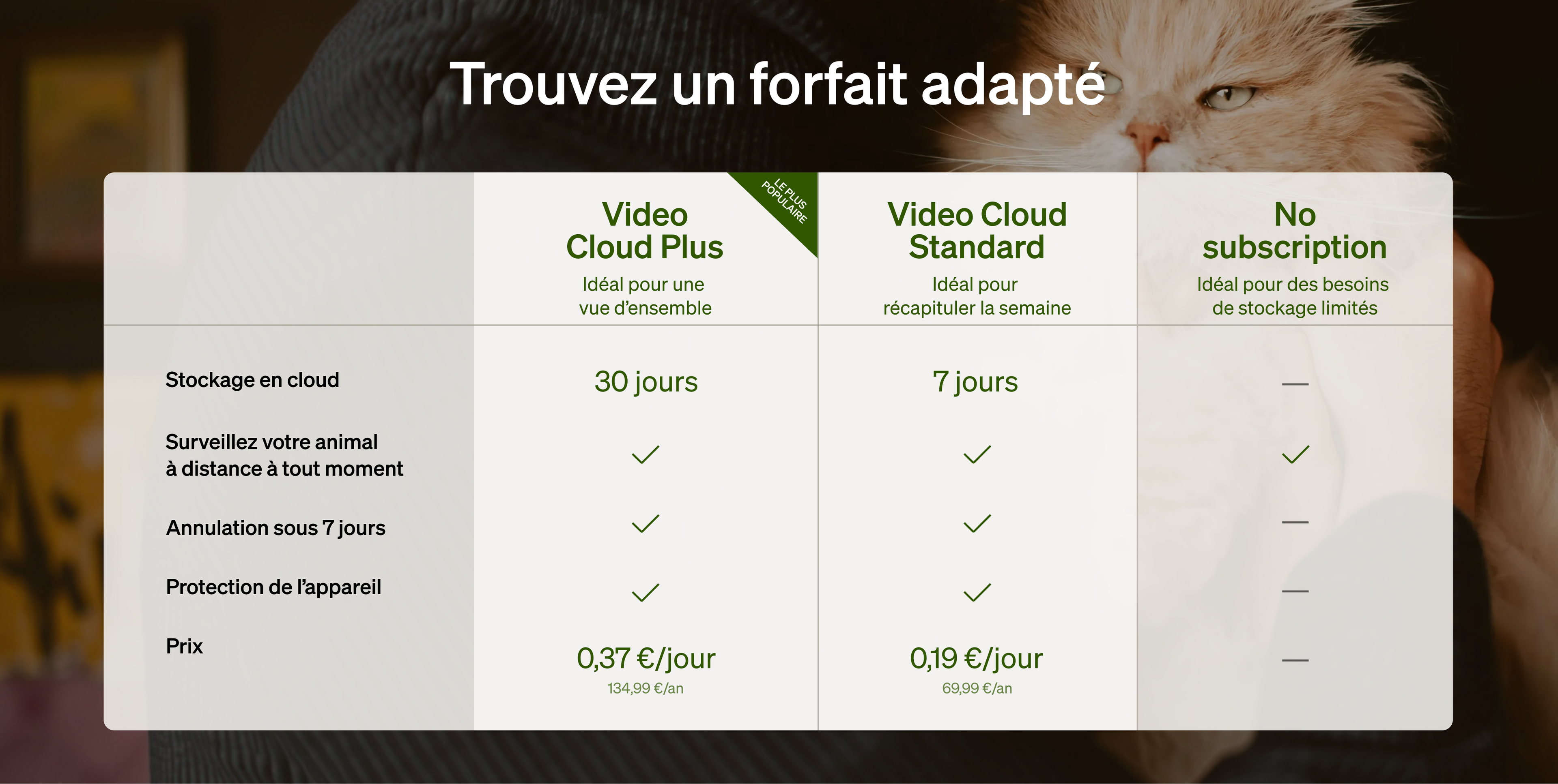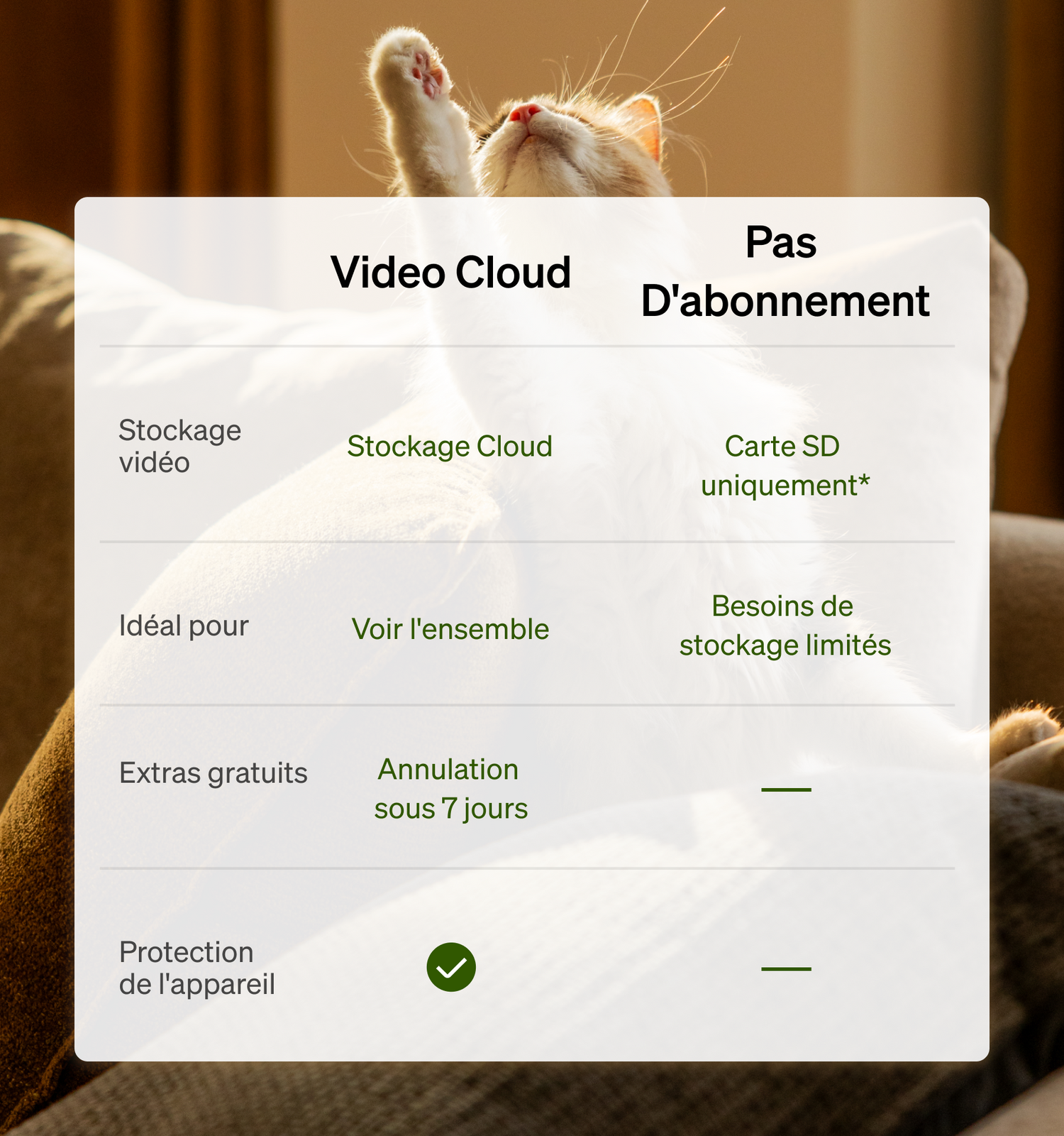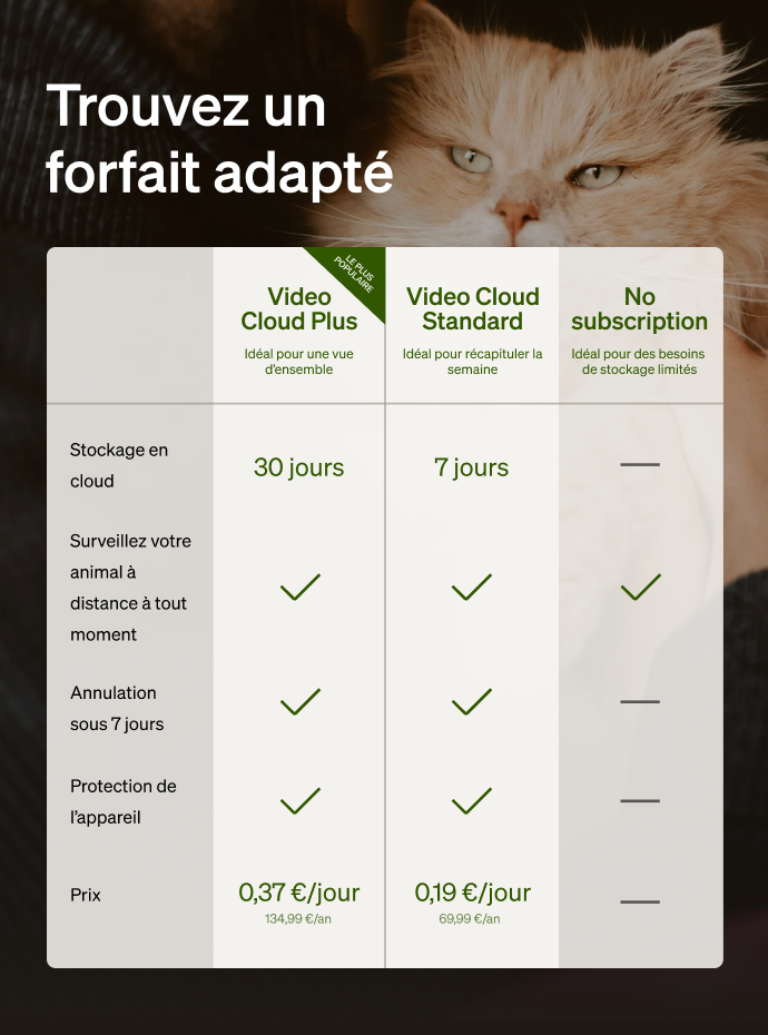 R: Video Cloud Standard vous offre 7 jours de stockage en cloud, tandis que Video Cloud Premium en propose 30. Choisissez votre forfait en fonction de la durée de conservation souhaitée pour vos vidéos.